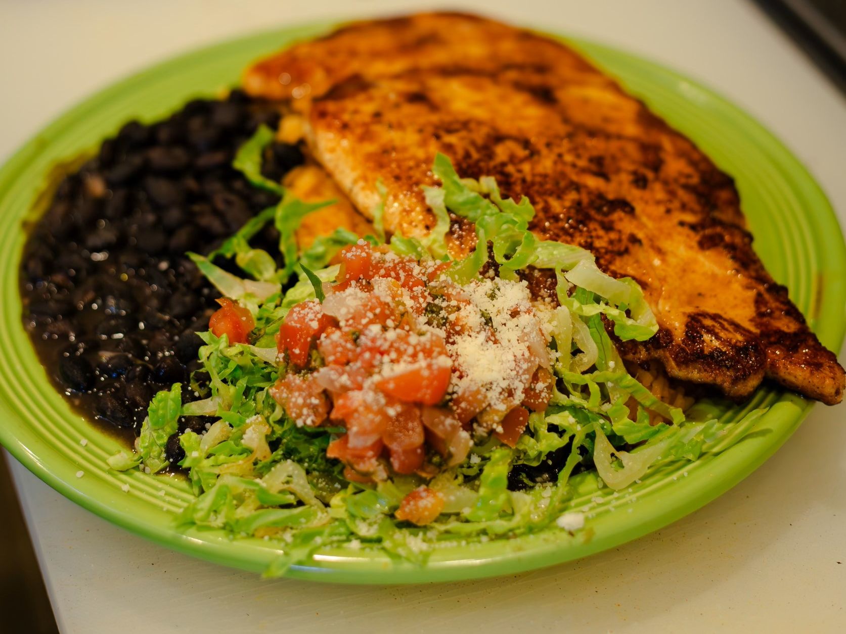 Our take on carne asada. Seasoned and flame grilled to perfection! - served rice or lettuce. Topped with fajita peppers and onions, black beans, lettuce, cheese, pico, tomatillo salsa, crema. Served with two corn tortillas.